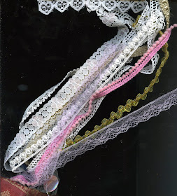 Laitoin sivujen taitoskohtaan pitsejä, jotka tulevat kirjan keskeltä alhaalta ulos