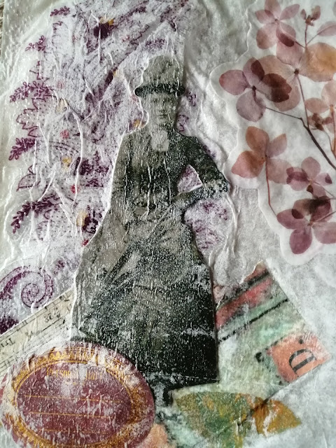 Pienen askartelunkin olen tehnyt. Kiinnitin 13 x 19 cm kokoiselle leivinpaperille kuvia ja koristeita mediumilla. Kuvien päälle kiinnitin servetistä yhden valkoisen kerroksen varovasti siveltimellä.